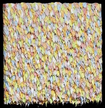 For the past five years Martin Mugar has been working on a series that combines thick paint, sculptural surfaces, and pixelated patterns of premixed colors. Is there a title for the series? “Not really,” he responded but an evocative term “pulled dots” emerged. Thick strokes of individual colors, in complex patterns, are applied then pulled away allowing gravity to form triangular, downward pointing wedges.