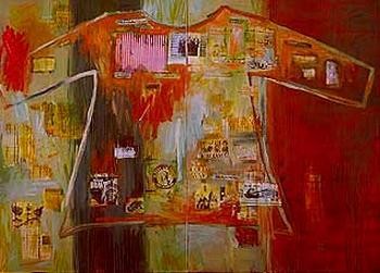 Several new, large, vertical, narrow paintings were propped against the wall in various stages of progress. I was familiar with them from web searches. There is a motif she has been working with that entails either native dress forms, devoid of the figure, or female forms, like a dress maker’s pattern. Around this life sized central image were a variety of birds and other elements. When pressed she related that they were about censorship, post 9/11, and the Homeland Security Act. The suspicion and guarded communication that has resulted in our loosing limbs as a metaphor for loss. Sometimes there is something inside the dress form, a child within, or a skeleton. She is also making a series of epic scaled canoes with a strong anti war message. Much of her post 9/11 work involves aspects of war and inhumanity but in a universal sense. More about all war than just this war. The nature of war. Warness.