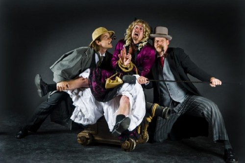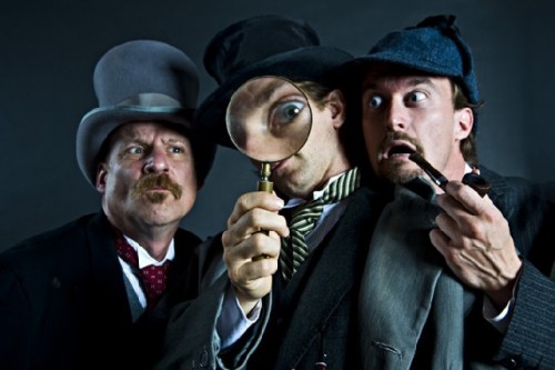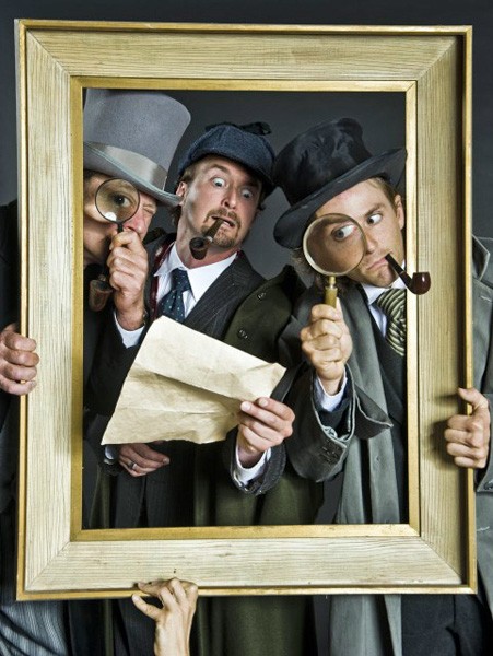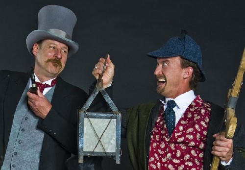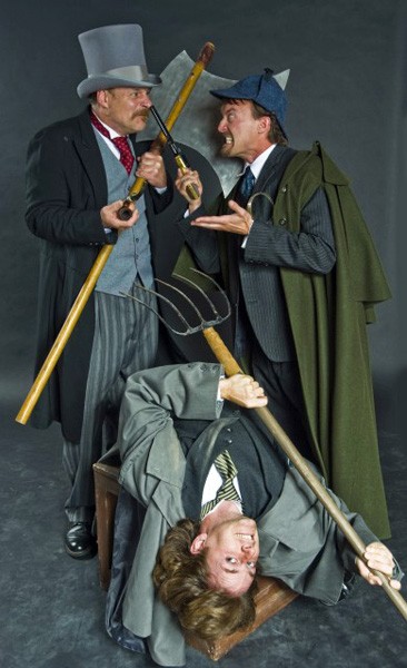 Though the play is just 90 minutes or so, there is an intermission to allow the actors to catch their breath, "and reload all the props," adds McCabe who plays Holmes, and many others. Watson is played by Jonathan Croy, whose character remains pretty consistent throughout. Keeping the 15 roles played by the other two actors straight is no easy task. "I have the most roles to swap back and forth, and I don't keep them all perfectly in character," says McCabe. "There's one scene where I play a character with a limp, but when I come on seconds later as Holmes, I sometimes find myself still limping because it happens so fast it is often blurry."