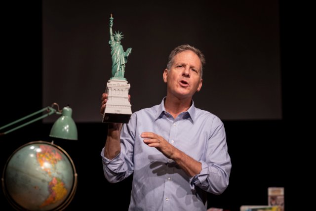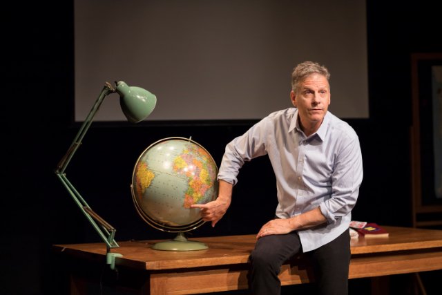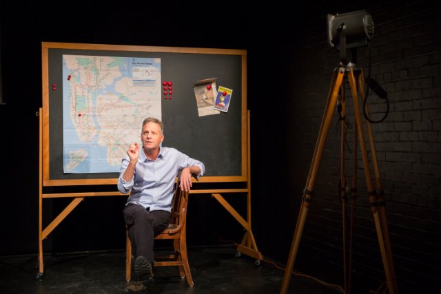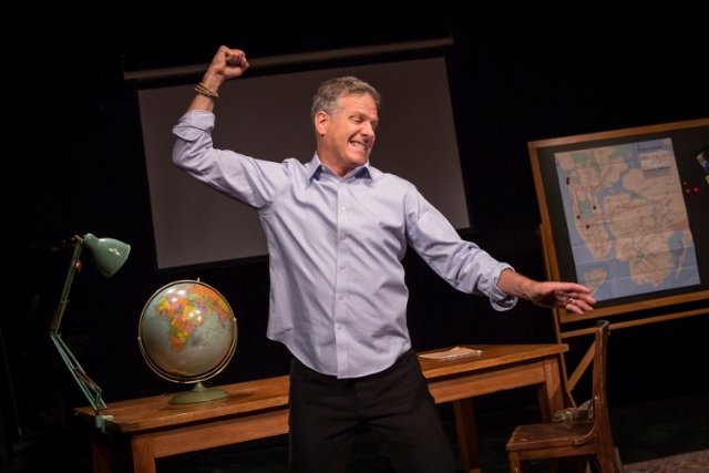 The stage set by Mark Wendland peoples more than the solo artist in our mind's eye. The use of maps locates Peter Jennings Way near Lincoln Center. Johannesburg and Las Vegas, among other global locations. We easily imagine a wicked stepmother who looks like George Washington, and a crumpled up old pederast.. There is a joyful refugee granted asylum after holding fragments of glass in the crook of his arm and the bend of his knee.