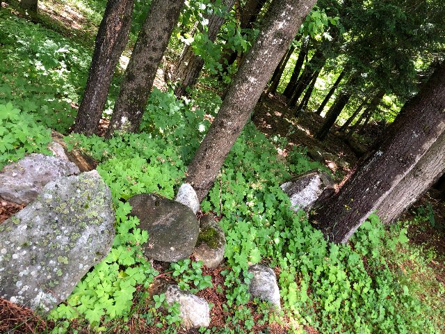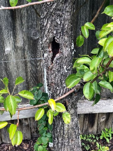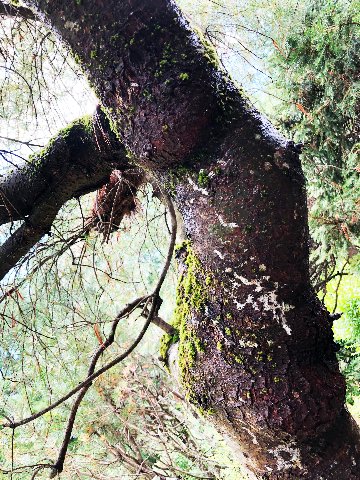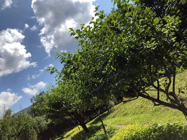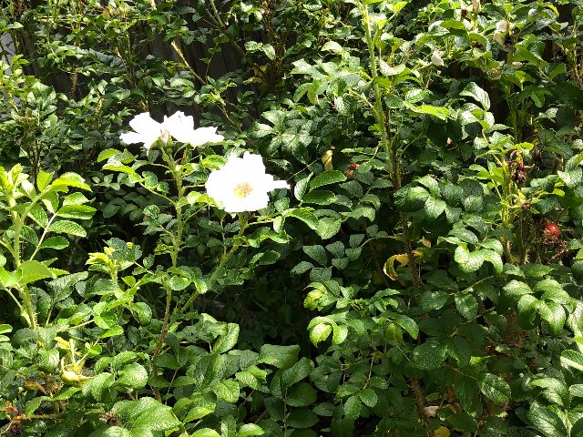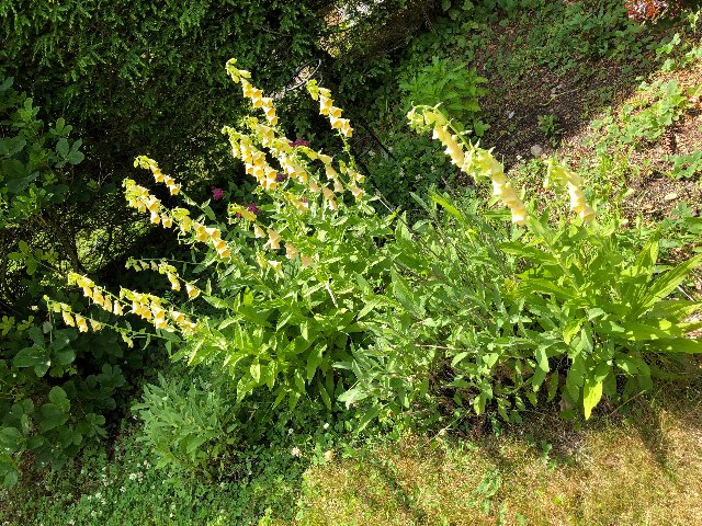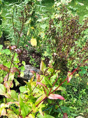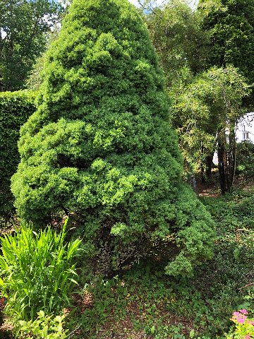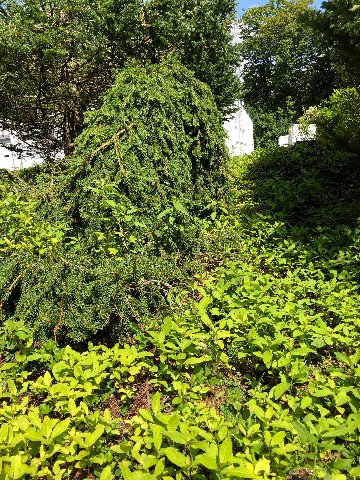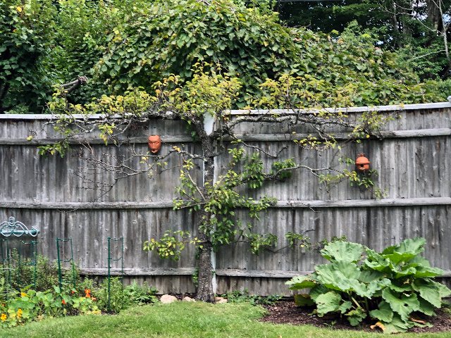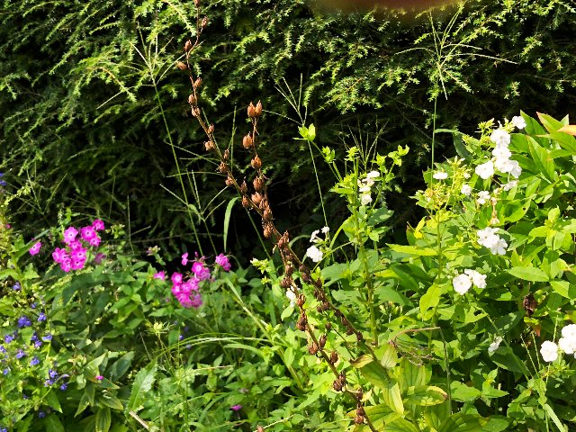 Her garden has three sizeable distinct areas, as defined by the long hedges. The outer rims of the garden close with long rows of low growing ground cover of Lamium or Dead Nettle adjacent to woods or Creeping Juniper in other places. Then, in addition, she’s created smaller areas like the espaliered (’flattened’) pear tree, which is growing along a wooden wall, branches outstretched. Unfortunately, apples and pears have been few this summer. It was just too hot and dry! And the garden is intended to be free of extra watering. Most plants and trees are mature and, the conservator, of course, refrains from watering.
