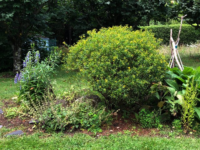 And at this point, more than 30 years later, Victoria is replacing trees or cutting tops of trees here and there to let light into a particular area, which would benefit adjacent trees and plants. Becoming more and more a gardener over the years she is not only concerned what would look good in a particular spot in the garden, but what would benefit pollinators, bees, butterflies, birds. She excitedly took me to a rather large St. John’s Wort bush, which was fully in bloom two weeks ago. One day, when she came out into the garden, there were hundreds (if not thousands!) of bees swarming the bush. “All different kinds of bees,” she said. I photographed the bush, of course; most of the sweet yellow flowers were gone. And, “there must be a beehive nearby, or several,” she remarked.