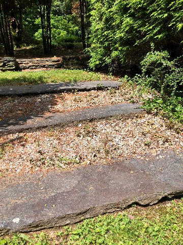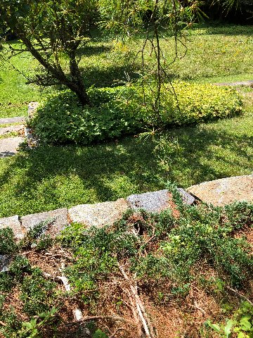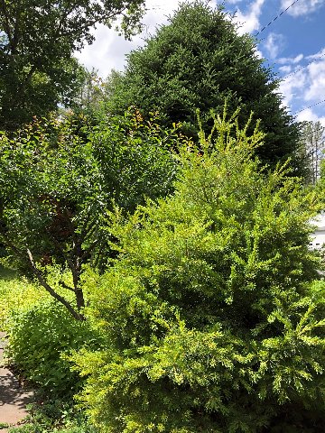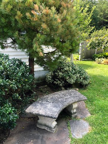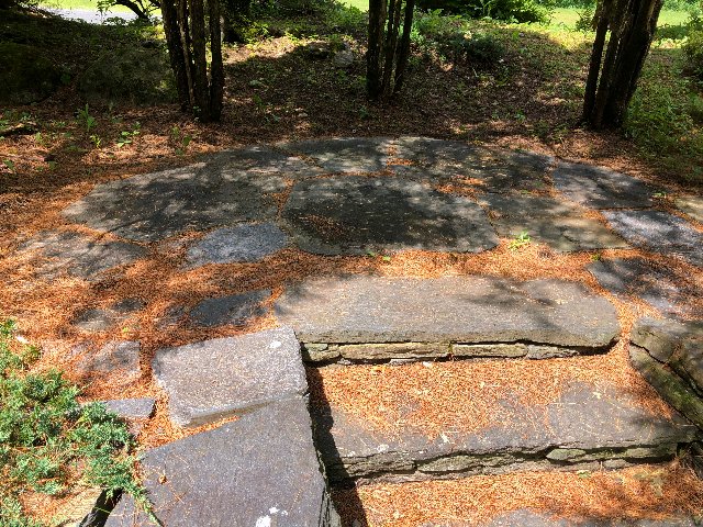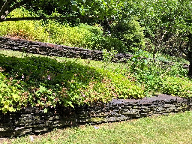 A long arching low stone wall, on two sides, made of Goshen Stones from Goshen, Massachusetts, ends in several steps up. Perhaps, there could be a small seating area inside the line of fir trees that shield to the outside world. A row of mostly fruit trees were planted near the stone wall on two opposite sides. Also, a line of six linden trees, in front of the first tall hedge, bloom with their lovely yellow flowers once or twice a year.