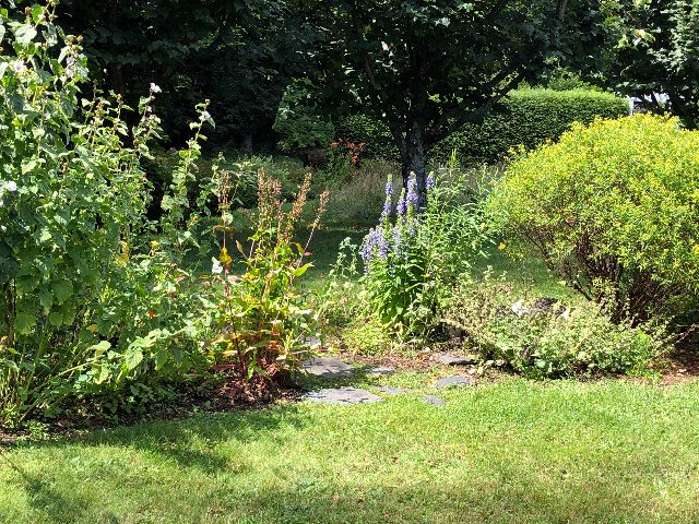 In the early 2000s Victoria went on an ‘Earth Watch’ trip in northern Spain. She described her garden to one of the leaders of the group, a botanist, wondering what was missing in her garden? She returned from the trip with: “We must install wild flower areas.” And so, they went ahead. A seed company in Charlotte, the Vermont Wildflower Company, supplied seeds by the pound and there are now three wild flower middle sections in the garden, changing flowers and plants throughout Spring, Summer and Fall.