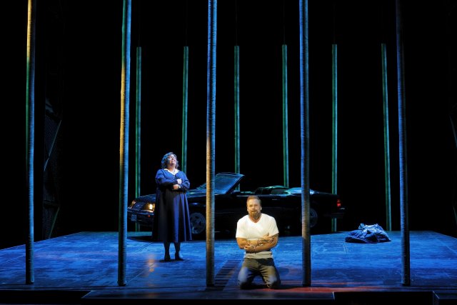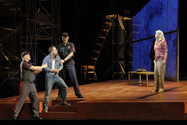 Central to the stellar staging is the steely prison set. Its daunting mobile components - catwalk, chain link fencing, and circular staircase towers are disturbing evocations of life behind bars, and dramatic lighting accentuates the isolation of prison existence. But all of the scenery gives a strong sense of place, even the occasional fragmentary sets or the projection-based views of rural Louisiana when Sister Helen first drives to Angola Prison.