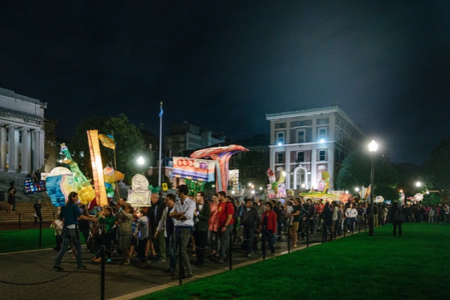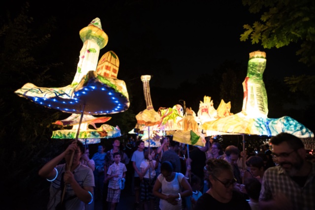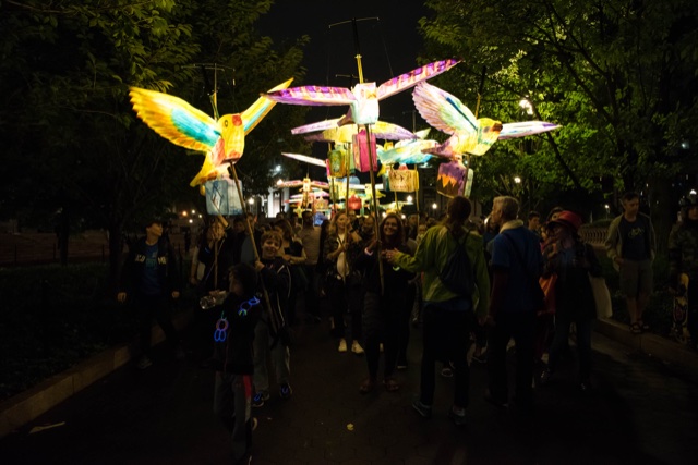 Puppets are often a part of what we do, but they’re not essential to our mission. Our main focus is on exploring the medium of community-built procession as a form of contemporary ritual theatre. Giant puppets can be a powerful tool for storytelling in procession, but we also employ masking, costume, mobile architecture and – notably in the case of Morningside Lights – lanterns and other illuminated structures. Perhaps all of these things, as materials in motion, could broadly be considered puppetry of a sort, under the rubric of what John Bell calls “performing objects”