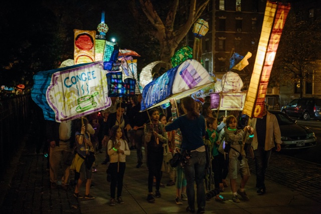 The giant lanterns for an event like Morningside Lights were inspired by the giant lanterns that parade for Fasnacht, the Carnival in Basel, Switzerland. Those lanterns were traditionally illuminated by flaming propane oven-jets, but with LED technology having come so far, we prefer using 12-volt LED bulbs powered by small rechargeable batteries. Ultimately we want to charge our batteries through solar cells, so that light from the day is borrowed to illuminate the night.