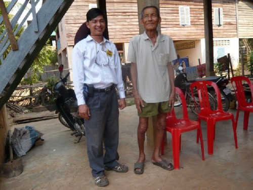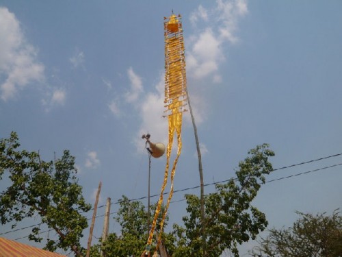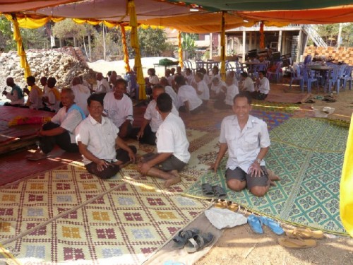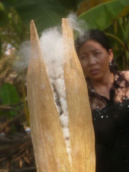 Entering Siem Reap province, which has a population of one million, we walked over the oldest bridge in the country, dating from the 12th century, the Golden Age of the Khmer Kingdom. In Kampong Keidei, Sang’s native village, we passed by a temple, catching a glimpse of a Buddhist celebration. Sang introduced us to his family and his 77-year-old father, who is half Chinese and half Cambodian. After enjoying tea and cookies with them, we toured the garden, learning about the kapok tree, a source of income from fillings for cushions.