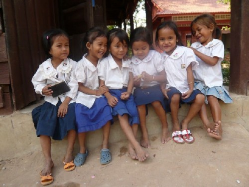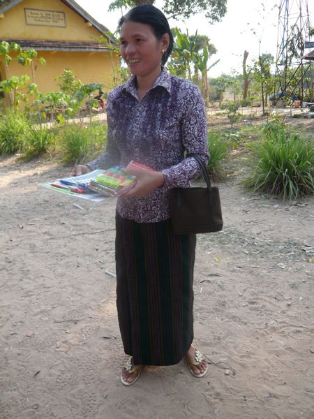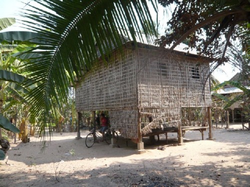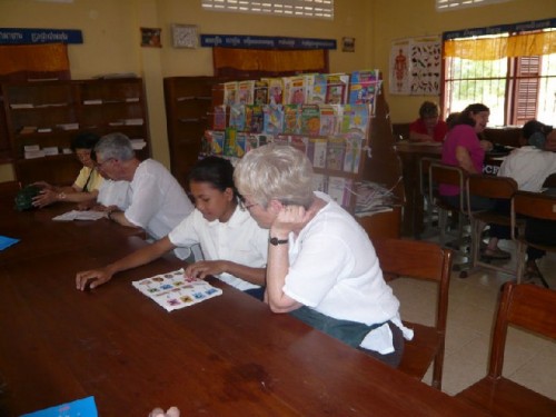 To obtain an impression of present-day Cambodia, we visited the nearby village of Krowarn and the Karmat primary school. The two-room schoolhouse accommodated one hundred children aged six to thirteen (fifty per room) — first and second grade students in the morning, third and fourth grade in the afternoon. The classroom displayed photos of the King and his parents, the former king and queen. Children put on a performance of traditional Cambodian dance, showing the intricate hand gestures they learn at a young age. We also visited the school library and read with the students. A 13-year-old, who took me around, gave me a drawing of her house, depicting a building on stilts and shoes left at the entrance. I was charmed by the details of this picture, as no Western child would have drawn shoes left at the door.