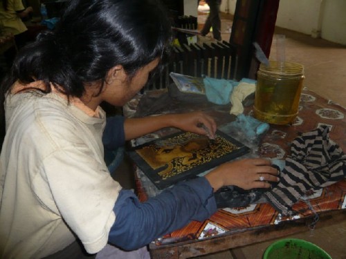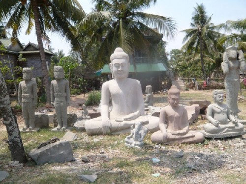Siem Reap is a pleasant, bucolic town of 300,000 people. Capital of the province by the same name, it lines the banks of the Siem Reap River. Sending our luggage ahead to the Tara Angkor Hotel, we visited a shop called Artisan d’Angkor and reputed for its high-quality handicrafts. Wood carving is a local specialty; teak, rosewood, and mahogany are the types of wood most frequently used. The shop had exquisite silk, as well as silver and lacquer ware. Here I bought a lacquer wall plaque of a zodiac sign painted in gold, an ox-shaped silver box traditionally used to keep betel leaves, and a carved soapstone Apsara.