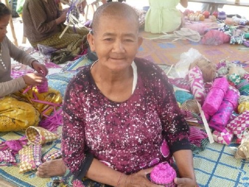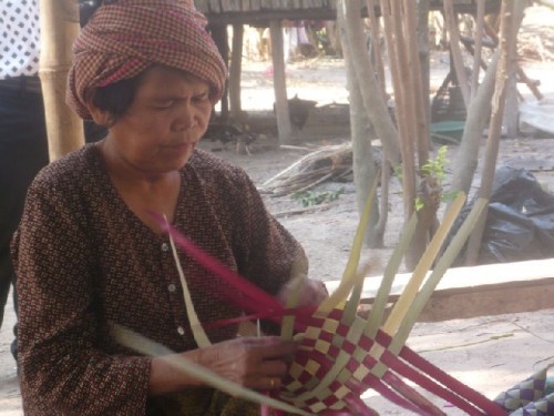 At the crafts village we watched women and children weave baskets, bracelets, and flowers out of palm leaves dyed in vibrant colors. 932 people lived in this village, under the watchful eye of an elected village chief. Among the weavers was a distinctive-looking 61-year-old nun with shaven head and no teeth. Some of the women wore the traditional krama — a versatile, checkered, scarf-like head wrapping unique to Cambodia. A young boy befriended me by presenting me with a bracelet and flower he had made. In addition to these, I bought a few baskets as souvenirs.