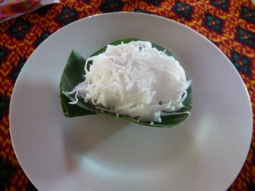 For our home-hosted lunch, we bought ingredients at the outdoor market, each of us using an assigned Cambodian word; mine was the word for “garlic.” Our host, a 27-year-old woman, had been to the morning market earlier to buy fish, meat, and vegetables to prepare for us, as lack of refrigeration requires daily shopping. Her chauffeur husband was at work, her year-and-a-half-old baby at her mother’s house. She made a delicious multi-course lunch, which was topped by a sticky rice dessert we helped wrap in banana leaves. Admiring our host’s traditional silk shirt with its Chinese collar, I asked where I could acquire one like it. She called her sister, who sold such items at the market, and had her bring one to me. Unfortunately, she did not have the color I wanted; I ended up buying the one our host was wearing!