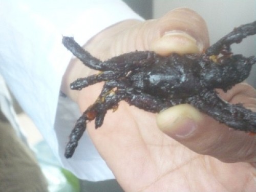 In Punching Provence on the lake, we enjoyed roasted lotus seeds. Other local delicacies in the market were tarantulas and crickets. Dipped in a batter of flour, garlic, sugar, and salt, they are deep-fried and sell for 25 US cents each in the case of tarantulas, 50 cents for 30 in the case of crickets. Tarantulas are dug out or pulled out of their holes with an instrument and killed by pressing the stomach. Attracted to light, crickets are trapped by suspending a sheet of plastic over a pool of water, so that they fly into the sheet, fall, and drown. Locals eat almost anything available: grasshoppers, banana and silk worms, lizards, and cobras. The latter go in whisky bottles for good eyesight, energy, and similar benefits.