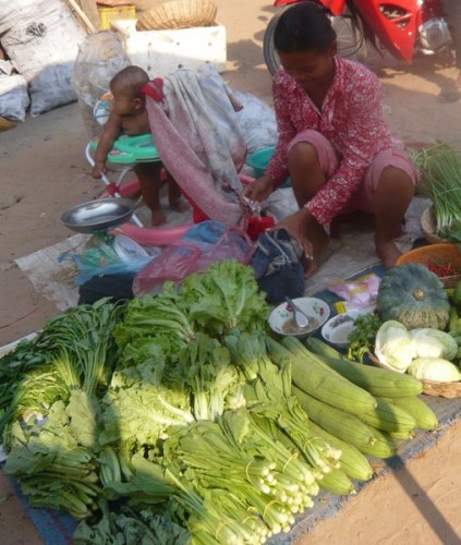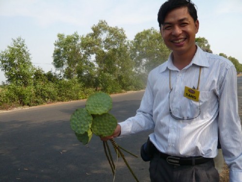 Traveling through the rural landscape, we passed by lotus ponds, rice paddies, tall haystacks, cows in brown fields, heaps of pumpkins, chili peppers spread on straw mats, shacks with hammocks, sugar palms, as well as banana, cashew, coconut, and mango trees. We stopped at a local market to buy a lotus plant, selecting carefully one without any brown leaves, as the fruit is eaten before the leaves turn brown. In Buddhism the different states of the mind are compared to the different levels of the lotus plant. One is asked, “Are you above the water, blooming like a lotus, or are you in the mud?”