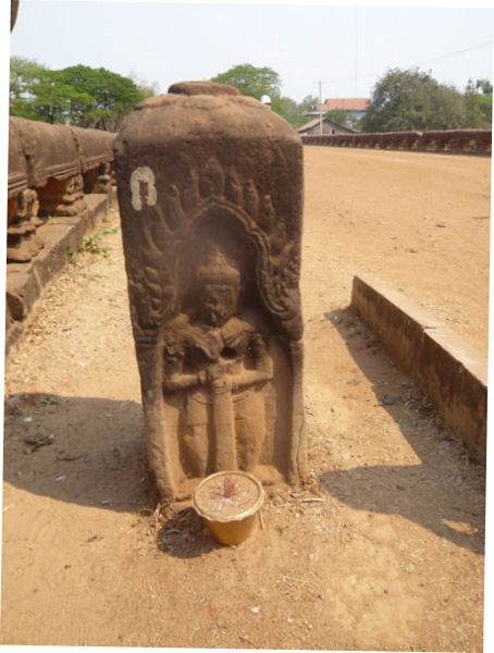 Buddhism is the state religion. Ancient temples are visited by pilgrims or tourists. There is a new temple for every two or three villages; communities raise funds to build their temples, which are mounted on stilts and covered with tile roofs adorned with naga tails. The multiheaded, hooded water snake called a naga in Khmer mythology, controls the rains and brings prosperity.