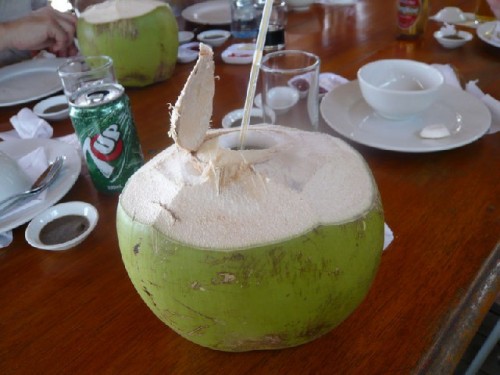 The “Stone Carvers’ Village” near a quarry had many stalls displaying sandstone works in various shades from beige to gray. Here I bought a figurine of Apsara, the mythical celestial dancing girl. At the “Brick Makers’ Village” we were greeted by many children and guided to the mud oven, where bricks are loaded and sealed for three days to bake. We distributed durian-flavored cookies as treats to the children. Our lunch stop by the lakeside was delightful, with coconut juice served in its green shell, accompanied by an ample spread of pork with ginger, fish and chips, beef with fried eggs, noodles with vegetables, and stir-fried vegetables. For dessert we enjoyed pomela, a fruit resembling grapefruit.