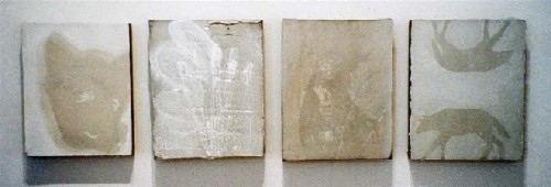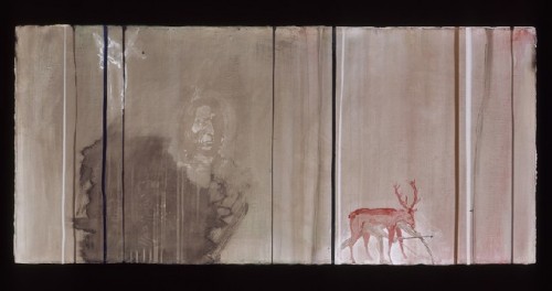 In the area of painting, RISD is regarded as second only to Yale. That theorist aspect became evident when we discussed the work in the studio. A group of small paintings were about to be sent to a show at Albert Merola Gallery in Provincetown (he was a fellow there for two years at the Fine Arts Work Center). Another body of work was shipped to the Aldrich Museum of Art in Connecticut for the show curated by Richard Klein No Reservations: Native American History and Contemporary Art. He showed this past season at Nina Nielsen Gallery in Boston.