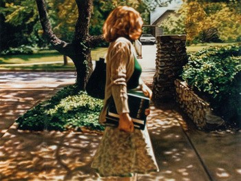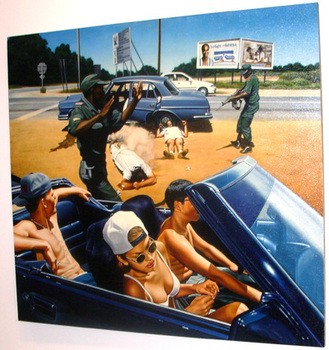 (As a postcript, during a follow up conversation with the artist after he read this piece, he has some clarifications. That the characters as depicted in the painting of "Sunlight Mildness" are literally modeled after the original source material, the photograph published by Greenfield. "That is not a self portrait of me or an image of Cecily Brown. They were meant to represent mindless kids who are self absorbed and oblivious to the horrific global events depicted in the background. There is a bit of the ass hole in me, like the kid in the back of the car, shirtless with his cap on backwards, but that character is not me. And in the original photograph the character smokes a cigarette. I agree with you about smoking and I would never attempt to glamorize it in a painting or any work of art. When Flash Art wanted it for the cover they asked if I would tweak the image and in that singular circumstance, yes, that is me, Cecily Brown, and John Currin is depicted as the driver. So you were a bit confused in the chronology of the story.")