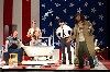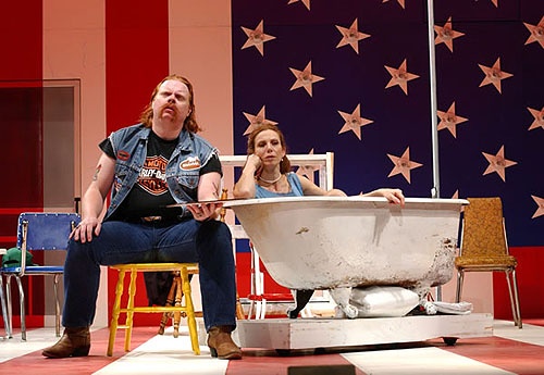 Much of the success of the play is conveyed by the fast pace of Bogart's direction and ironic humor. Some skits are funny and work, but others, less so. The best moments occur when the entire ensemble is caught up in sweating to the oldies or romping through a down home country square dance. It is more difficult to get to know or particularly care for any of the individual characters or sub plots. At the end of a lively ensemble dance scene a man gets shot and is held in the arms of his lover. During this poignant moment the Biker reels off a bunch of chicken jokes. The gay couple had aspired to set up a chicken farm and there were references as to whether, like Frank Purdue, they will grow to resemble their birds. At some point that results in a character dressed as a chicken slowly making its way across the stage.