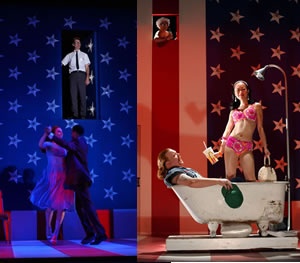 As we await the beginning of the play there is a large L shaped drop cloth that covers a wall taking up about a third of the back of stage allowing us to see the bare wings. This generic cloth cascades down and forward to the edge of the stage. A couple of stage hands arrive and pull down the cover, remove it, and reveal a backdrop of a big pop American flag, with large light bulbs screwed into the stars. The stripes are painted onto the stage floor. The set by James Schuette allows for a house façade with door and upper level windows, as well as moments when it becomes a Star Spangled Banner in every sense.