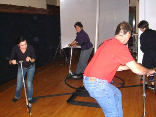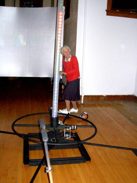 So, perhaps, there is a generation gap to overcome, at least for me, in understanding the basis of the work. But that didn't seem to stop a rather elderly neighbor from embracing their exhibition. One of the works, taking up most of the gallery space, is the Krinkle-O-Tron by Leif Krinkle. It is a rather elaborate device which involves four scooters attached to blades which by foot power turn a device which creates energy to power a screen of images and a sound track for Stanley Kubrick's 1971 film "A Clockwork Orange." The formidable and adventurous senior took a turn at making the piece go round and round. Hey, if she can do it, wellÂ…