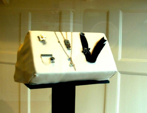 Also in the window passersby may view the Solar Jewelry of Leif Krinkle, Alice Planas, Hatti Lim and Meridith Silverman. Again, the small wearable pieces entail means of storing solar energy during the day and producing illumination by night. Recently, an MIT student, Star Simpson, wearing a similar piece of jewelry was arrested at gun point while attempting to board an airplane at Boston's Logan International Airport.. It appears that the world, or at least Homeland Security, is not ready for such techy wearable art during a time of threats of terrorism.