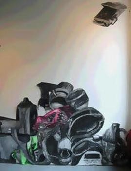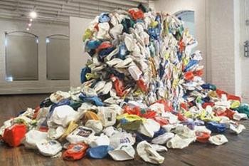 After some initial research Sophie not only convinced Michael Crowell, the operations manager of FCR in Charlestown, of the legitimacy of her request, he has subsequently been a friend and collaborator for several projects. The first sculpture with recycled waste material was created during time as a resident at Skowhegan School of Art in Maine. It was a portfolio of images from that early work that inspired me to include her in the well received “Stitches” show. It was a real coup and a lively conversation piece that served to draw passers by to wonder what was up at the college. Just what was the pile of junk doing in front of the library? And, of course, was that really art?