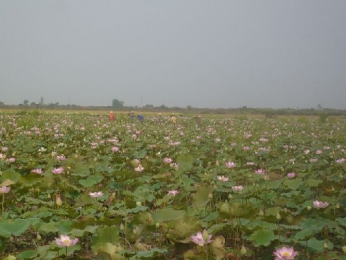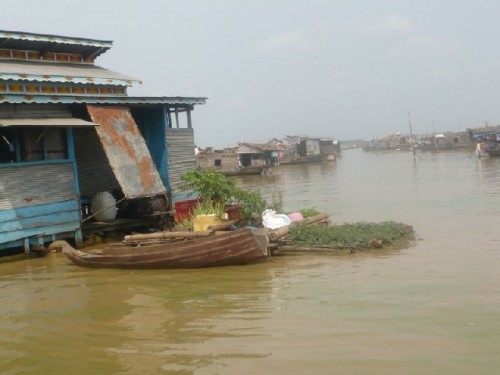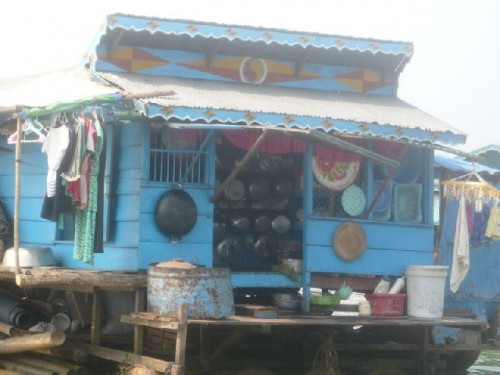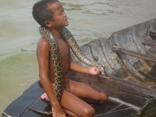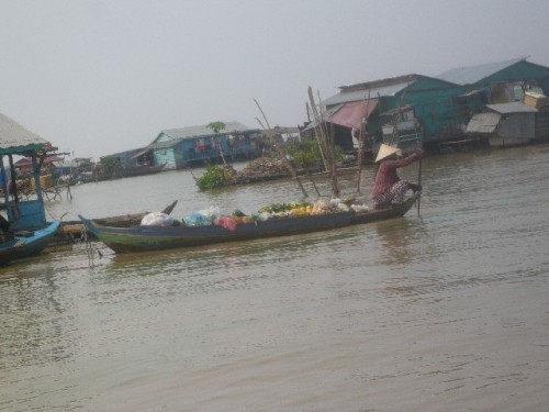 We visited a fishing village, one of 170 around the lakefront, where daily life glides by on the water. In this village of 3000, people lived in floating thatched-roofed houses on hollow bamboo poles, some with their own gardens and guard dogs, and all with TV antennas. Our boat followed a fairly wide main thoroughfare, with narrow passages between houseboats and extensive fish traps. The lake is a sanctuary for birds and home to 107 kinds of fish; yet it is not deep. The boats’ propellers churn up its rich silt, spewing pieces of brown sediment into the air. On our boat route we passed women selling fruits and vegetables from a sampan, fishermen selling their catch, and naked boys enticing tourists, with snakes wrapped around their necks. Other points of interest were a floating market, a Catholic Church, a community center, and a school where children arrived by rowboats, the older ones transporting the younger ones. During recess they bought snacks from vendors who arrived by boat. Children in neat uniforms rowing themselves from their houseboats to school were memorable images.