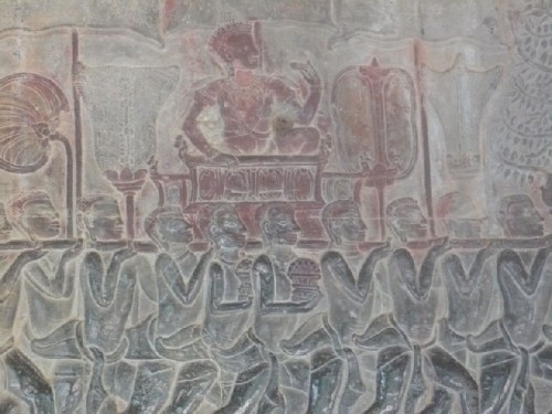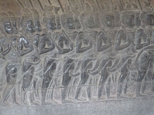 After our descent, we entered the central sanctuary and then circumambulated the gallery of basreliefs along the perimeter of the massive edifice, as we viewed the Hindu epic Mahabharata in elaborate stone carvings. A bas-relief most remarkable in terms of execution was Churning of the Ocean of Milk, a Hindu creation myth. A huge panel depicted 88 devils on the left and 92 gods on the right churning a sea of milk with a giant serpent in order to extract the elixir of immortality, encouraged by singers and dancers — individual in dress, hairstyle, and ornamentation — overhead.
