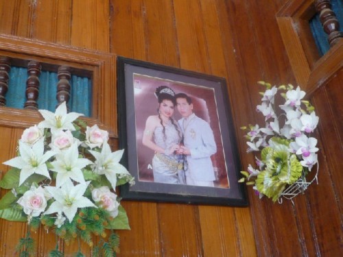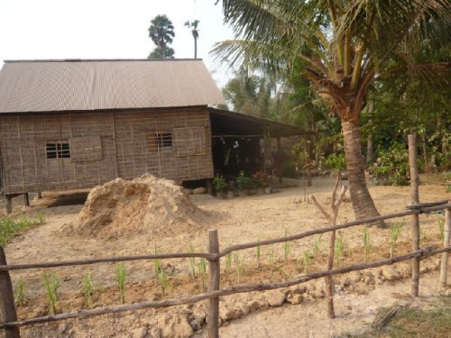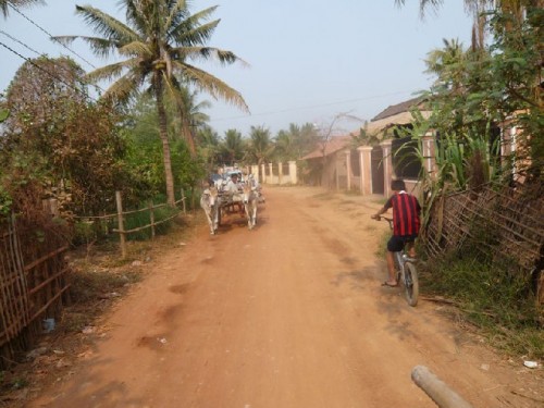 On our last day we traveled by oxcart to a local village south of Siem Reap to observe a day in the life of a rural community. Our group of fourteen split up and mounted seven carts, as each held two passengers. We entered the village on a dirt road lined with huts, some looking very modest and others more upscale. Here most people made their living as rice farmers. After our farmer host unhitched the two oxen on our cart from their yoke, he handed them over to his brother for feeding. Then he introduced us to his family. We walked around the spirit house to go upstairs and entered a large room built on concrete pillars. The room served as the living room and bedroom. There were wedding pictures of family members on the wall, and mats serving as bedding neatly stacked in a corner. The ground floor was used for rice storage. The family also raised crocodiles for their skin.
