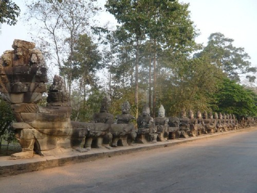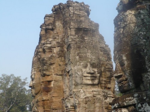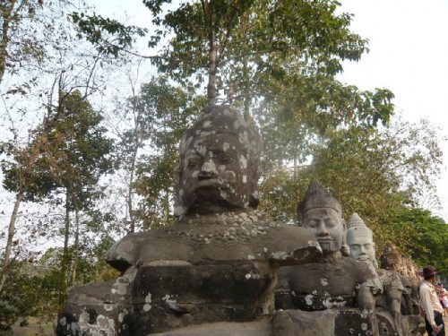 Our tour of the vast urban complex, sprawling across an area of roughly 96 square miles, started at Angkor Thom (the Great City), surrounded by a defensive wall and outer moats, which were a link in the system of canals and reservoirs, designed to control the seasonal deluge and capture water for later use. We entered through the South Gate, one of five approached by causeways across the moat. Walking down the causeway, we were flanked by 108 large stone figures, on the right 54 gods and on the left 54 demons, all pulling a great snake supported on their knees. We continued on to Bayon, a celebrated temple with a four-faced statue of Buddha symbolizing equanimity, compassion, sympathy, love, and kindness, and built atop a Hindu shrine.