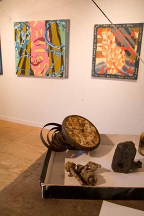 Looking around at a densely installed gallery at the Eclipse Mill in North Adams, with clusters of different themed paintings, several sculptural assemblages of found objects, and a spider's web of strings leading from one wall area to another with hand made signage explaining things, the artist, Larry Alice, who also answers to Larry Kurowski, commented that "I have been working on this my whole life. Taking things apart and being fascinated by the idea of systems."