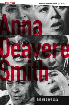 Currently, at the American Repertory Theatre, in Let Me Down Easy, Smith is performing another of her unique one-woman shows that focuses upon various aspects of the notions of "grace." She places moments of people's lives overlapping and side-by-side. Words, gestures and images form a textural and highly visual work. Constructed from interviews and archival pieces, Smith wrestles with the conflict of grace and kindness in a world of almost unfathomable distress and suffering. There is no storyline but a clear narrative theme between, through and overlapping Smith's vignettes.