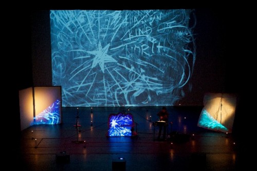 Visual staging echoed Anderson's soliloquies that are a kind of talking blues which in turn, amplified her music. Whatever dissonance we experience is bearable as it is rooted in a traditional harmony. Soaring from the mundane to the cosmic Anderson created an immersive experience. Videos of rain drawn-down by gravity across fogged-in windows expressed her lumbering grief writ-large. This image was doubled by Anderson who slowed down the action (and, sound) of drawing her violin bow across its strings to create a meditative space for awareness through a stretched-out tone. In another scene, videos streamed a succession of childish drawings and fragmentary phrases scrawled across a blackboard, then erased and covered in layers, to begin again. The raw immediacy of Anderson's visuals contrasted the remote, vast spaces of her often lonely sonic landscape, which are punctuated by the collaged rhythms of her spoken texts.
