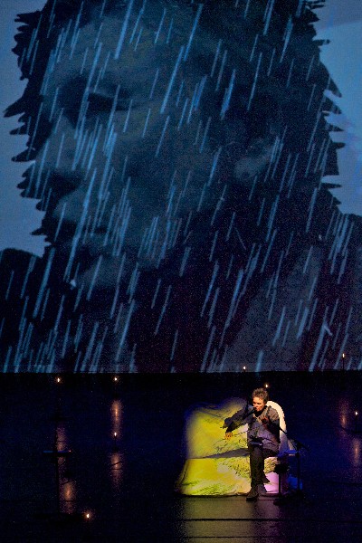 This twice-told tale alternated between two commentators, the wry, awe-struck Anderson and Fenway Bergamot, the forlorn, wizened elderly gentleman who is her self-described alter-ego and conscience. Anderson moved on stage between four make-shift but, strategically placed screens, the central screen being at once, the comforting seat where she reflected on life and, a final resting place or grave. How do we begin anew? she asked, how do we begin a new era? Twirling down across three screens in slow-motion, we watched the spent brown leaves of Fall. The core belief of Delusion is that words and stories can create the world as well as make it disappear. Anderson's virtual collage was ‘of such beauty’ as Lou Reed suggested ‘that a more enlightened civilization would build a monument to her’.