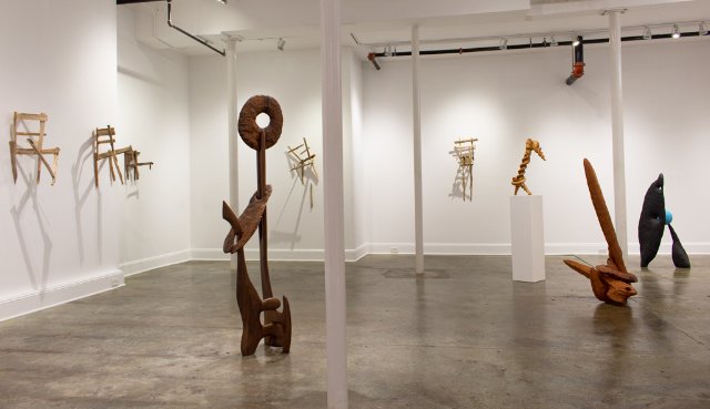 In "Wood Play" both artists are having fun with the materials and the forms. The work in this exhibition evokes that joy. Muller's assembled sculptures play with sticks/lines, broken, abrupt, and jagged. They are simple intelligent collages, with a touch of wry humor. Abner discovers forms by following the shapes and grain of the wood he is carving. The work is fresh, like new growth that is finding the sun for the first time. Abner and Muller are captivated by the materials they use, and share the pleasure they have making the work.