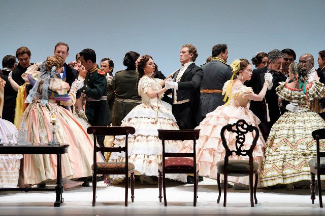 What gives particular significance to this realization of the opera is that it reprises Robert Carsen’s noted production, with production design by Michael Levine. The three closed sides of the stage are comprised of unadorned white walls. Its minimalism looks sterile at times, but it does offer a blank canvas for expression. Colored light casts against the walls to give differing effect – golden-orange for the autumn, with colorful leaves covering the stage; dark blue for the night of the letter scene; gray for Onegin’s rejection of Tatyana. Most striking is the silhouetting used in the dueling scene to darken the mood.