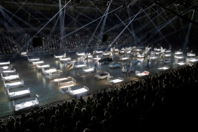 Before I entered the Armory, I knew that Schubert had died young of syphilis. I knew that the songs Jonas Kaufmann would perform, Schwanengesang, were among his last works. Opening the performance up with a theater on the floor of the Armory I may have expected some relationship between the composer's diseased mind in the tertiary phase of syphilis (a la Nietzche and the famous fictional composer Adrian Leverkühn of Thomas Mann’s Dr. Faustus,). I immediately found it.