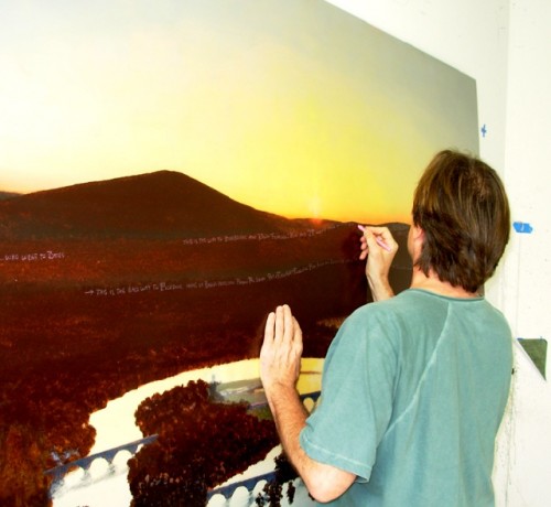 Mass MoCA is so important to him that Hannock has started to catalogue his works by numbering them Mass MoCA 1, 2, 3, 4, etc. The area seems ideal as he got out of the hectic New York art world and is able to maintain a low profile while doing his work. When his wife passed on a couple of years ago he assumed the difficult task of being a single parent and answering his daughter's tough questions. Part of that experience is embedded in the work and in the Oxbow he pointed out some images, a snap shot of the daguerreotypes that he and his wife posed for by Chuck Close, and texts that are now largely invisible. There is a darkness of mood to the painting and subject of which he has created a number of versions. The precise time of day is twilight and the sun has just slipped down behind the horizon. Commenting on that I quoted from Longfellow "Between the dark and the daylight, when the night is beginning to lower, comes a pause in the day's occupation, that is known as theÂ…" I paused for him to fill in the line. Then continued "The children's hour."