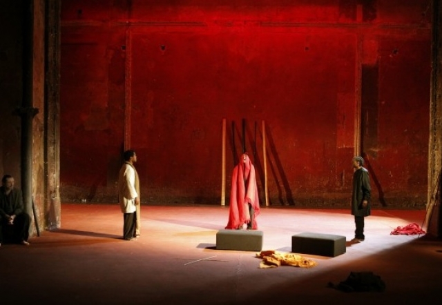 Three brightly colored pieces of cloth add the only brightness to the set. Of ochre yellow, royal blue and startling red, they are first used as cloaks. They have a surprising destination which is fanned by millenials in the rafters as the play progresses.