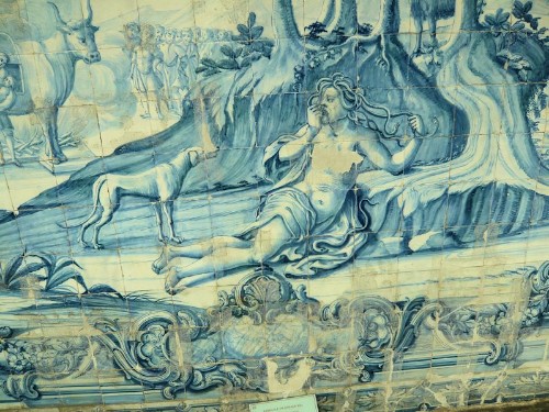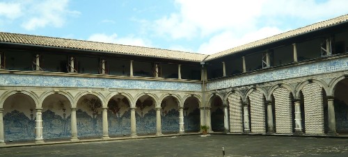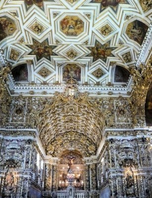 On the adjoining square, the Praca Anchieta, are the opulent baroque Church and Convent of San Francisco. The interior of the highly decorated 18th-century structure has intricate wood carvings encrusted with gold leaf, a gilded high altar and a painted ceiling with scenes associated with the Virgin Mary. Blue-and-white hand-painted Portuguese azulejos (pictorial tiles) depicting scenes from the life of St. Francis, combined with elaborate wood carvings, adorn the choir. The tiles also surround the courtyard of the convent annexed to the church.