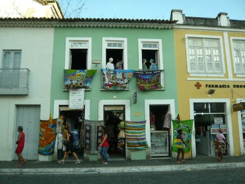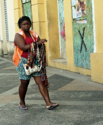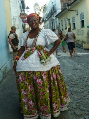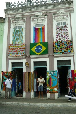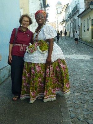 For the rest of the afternoon we meandered about, browsing in shops. Thanks to the exchange rate of about 3 to one favorable to the dollar, I was able to buy a multi-colored hand-knit linen top for a fraction of what a hand-made item would have cost in the States. Having made a purchase, I was allowed to take a picture of the shopkeeper in her typical Bahian hooped skirt.
