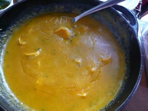 Salvador is right on the Atlantic Ocean. On the ride to the Barra district — where our hotel, the Monte Pascoal, was located — my first impression was one of sensory overload as we approached the closest beach to downtown. Lush greenery was all around, along with pockets of visible poverty with run-down houses and shops, plus beach umbrellas as far as the eye could see. The boardwalk teemed with people jogging or walking, with or without dogs, some pushing strollers. Musicians entertained passers-by. Sidewalk cafes and bars overflowed with conviviality as locals enjoyed a beer after work. Enticed by the festive ambience, I went back out as soon as I dropped off my bag. As I made my way through the crowds, I noticed my friends, who had arrived earlier, at a sidewalk restaurant. I joined them over a bowl of clams in broth with a choice of garlic or pepper sauce, thus ending my long day on a delicious note.