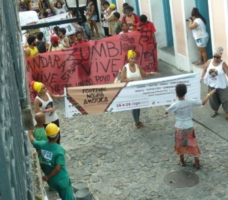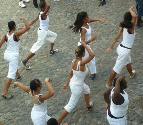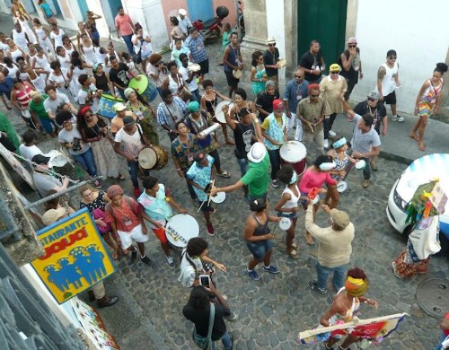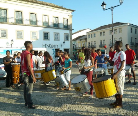 Our lunch stop was at a traditional restaurant with rustic decor, where we tried the local specialty, bobo de camarão, made of shrimp and mashed manioc cooked in coconut and palm oils. The hearty dish was delicious. Meanwhile, loud drumming on the street prompted us to dash to the balcony of the second-story restaurant. A banner leading a parade of musicians and dancers called attention to an upcoming three-day festival of American Black Art, including cinema, dance, music, theater, and exhibitions. The banners were followed by drummers, people playing shakers, and performers of capoeira, a Brazilian martial art that combines acrobatics and dance.