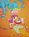 Imagine this show as candy for the eye and, for those who quiver at the sight of the surrealist distortion of bodies, queasiness in the stomach. Hiroshima-born Akikazu Iwamoto, now forty, fills his compact solo show at Stux Gallery with wildly imaginative, candy-colored paintings and drawings that involve amusing and sometimes frightening bodily transformations. The result was a surprisingly confronting, and often wicked, commentary on our inflated inner desires.