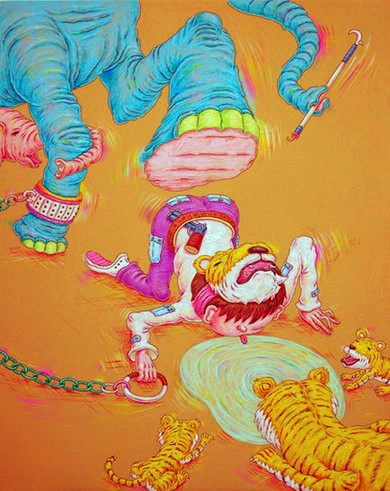 His earlier drawings featured more animals, and color combinations were brighter and less sinister. In his recent paintings, which greatly resemble his drawings in their beige paper-like background and in the crosshatching-like brushstroke. The spontaneity and experimental energy of his earlier drawings lingers, however, the subject has grown distressingly dark and confrontational.
