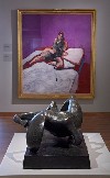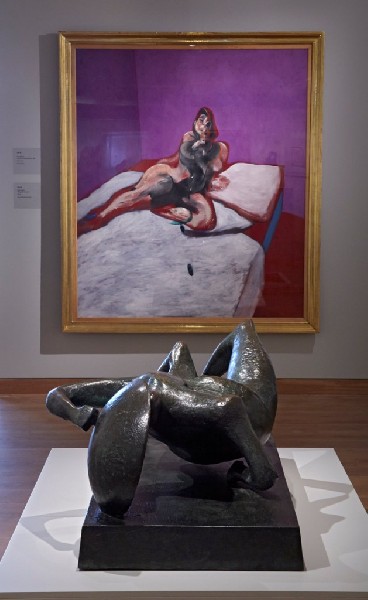 Bacon’s Lying Figure and Moore’s Reclining Figure share a striking visual collaboration; but Moore’s sculpture is a physical reality whereas Bacon’s figure is a theatrical construct placed in its own caged environment—and is all the more powerful for its decadent sanguineous fantasy.