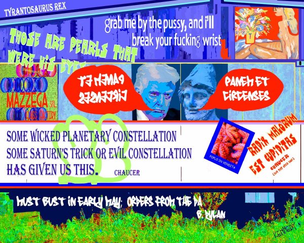 The scope of this exhibit is threefold: the personal relates to family, health & illness, farms, food, music, and quantum gravity (for no discernible reason I became very interested in it). The poetical speaks for itself, and ranges from ancient Latin to the Beach Boys, with a heavy emphasis on Eliot, Auden, Bob Dylan, and Shakespeare. Where phrases appear without attribution, they are from my original poems. Finally, the political. We are at a very dangerous turning point in this country, and I feel any and every form of protest is not only appropriate but necessary if we are to regain any semblance of a democracy.