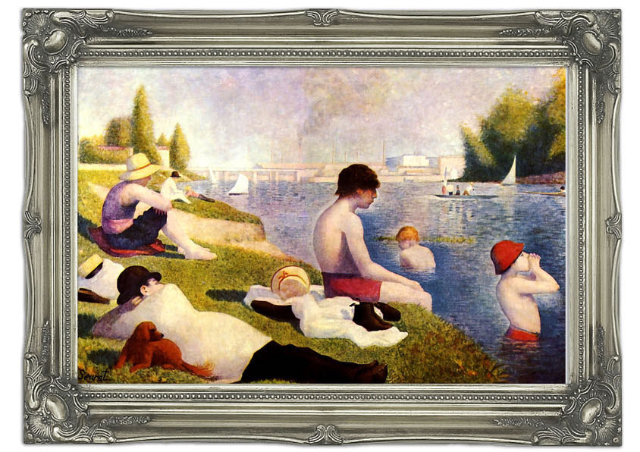 A wonderful visual vignette takes place. A group of rowdy swimmers seems to overwhelm the serenity of the park. The group becomes a stunning living tableau of Seurat’s second most famous painting, Bathers at Asnières.