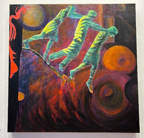 Were these dream inspired, I inquired? Reluctant to discuss specifics of the work she referred to the title of a work “White Mares.” It depicts several horses evoked by “Night Mares.” Without deconstructing her diverse subjects let us say they are the product of the heat oppressed mind.